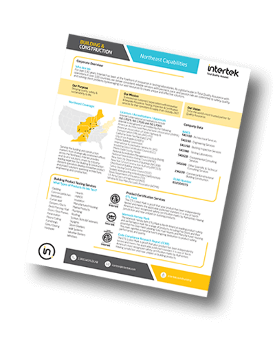 In the Northeast's dynamic building and construction environment, Intertek is your partner for overcoming complex challenges. We offer a broad spectrum of services, from ensuring product safety and code compliance to addressing environmental concerns and optimizing building performance. Fill out the form below to download our Northeast Capabilities Sheet to learn more.